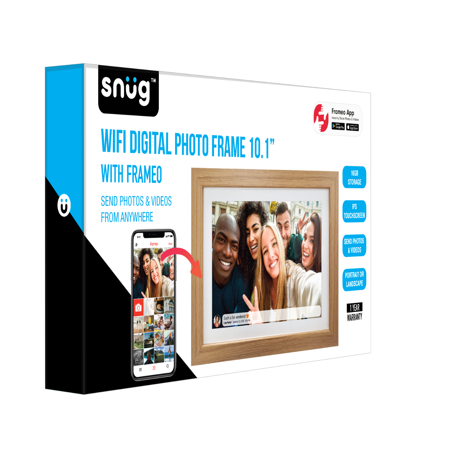 Receive wonderful photos and videos from friends and family with the Snug Wifi Digital Photo Frame with the highly rated built-in FRAMEO software. Use the free Frameo app to send photos and videos with a short caption directly from your smartphone to the Photo Frame – wherever you are in the world. The photos will appear on the digital photo frame within seconds, so you can enjoy the moments as they happen. The Snug Wifi Digital Photo Frame has a touchscreen that makes it easy for everyone to use.